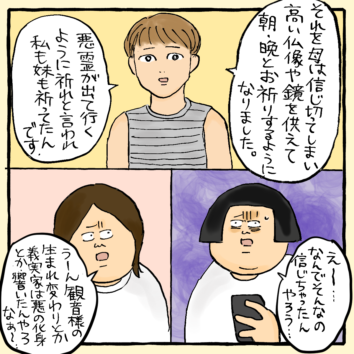 宗教のお参りしてる道具??が当時家にあったお参りの物と同じ絵だったので、ゾッとしました。