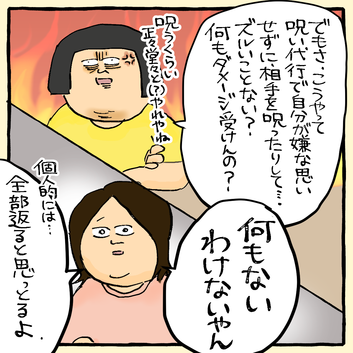 何かしら自分の犠牲を払ってまで呪いたい相手を呪うんでしょうが、それはもう自分が一人で残りわずかな命で尚且つよっぽどの恨みでないとやらんやろというか、他のやり方で倍返しした方が楽じゃない?って思っちゃいます…