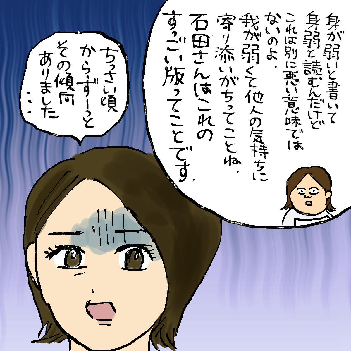 石田さんは男関係だけじゃなく、たぶん身内、友人、知人でも都合のいい人にされて苦労してきたんだろうなと察します。応援してます。石田さんが幸せになることが大勢の身弱たちの励みになると思います。