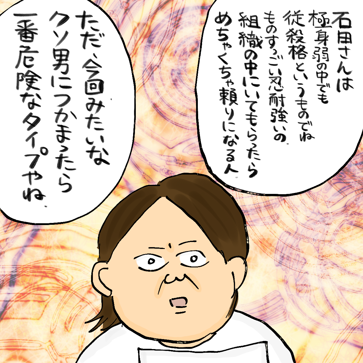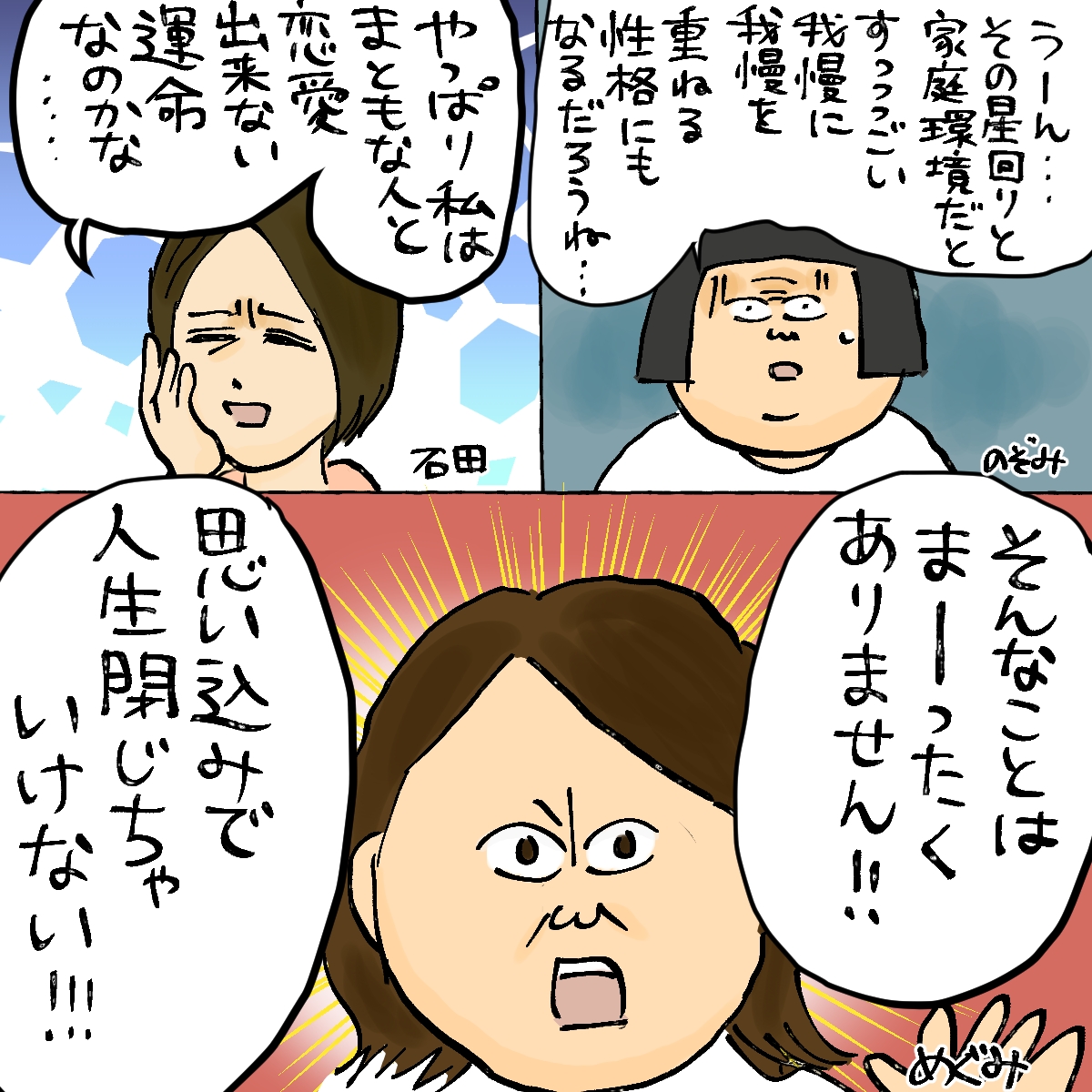 石田さんもご自身の傾向に気付けたとこは今後の人生にも大きいと思います。きっと幸せに向かってます!ᕙ( • ‿ • )ᕗクズ男との戦い頑張って下さい!