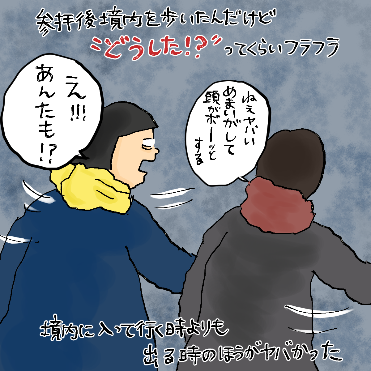私も1,2回神社に足を踏み入れたのですが…相性が合わなかったのか、1回目はちょっとしんどくなってしまい、2回目は濃い濃い霧の中にいるみたいに目の前が真っ白になってしまって先に進めなかったです😭
