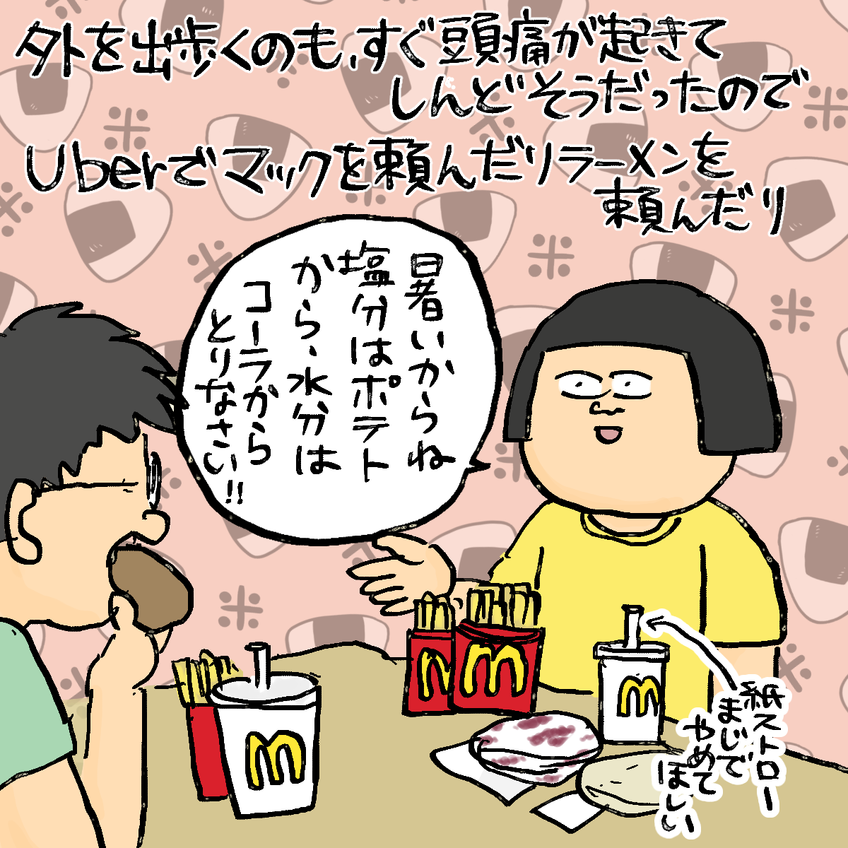 水分はコーラ。 食欲なくてあんまり食べられないし、あれが食べたいと言われて作っても食べられないことが多かったけど、Uberで頼んだら、残されても私も(キーーーー!!!!せっかく作ったのに!!!!)と思わず済んだよ。