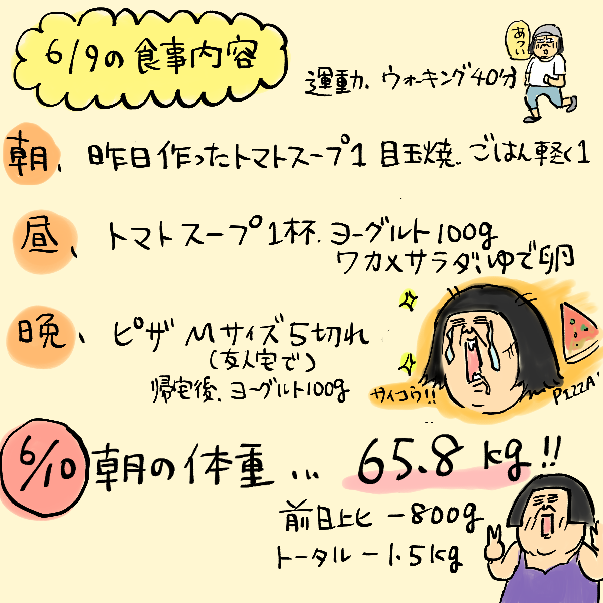 ピザを食べたから増えてるのを覚悟したけど、むしろ800g減ってた!!
