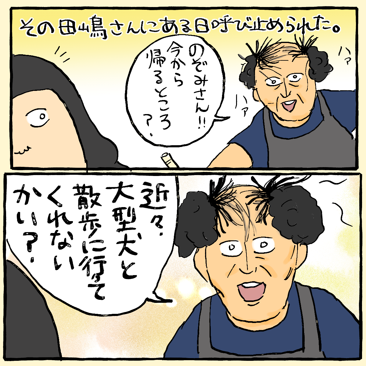「近々、大型犬と散歩に行ってくれんやろか?」
