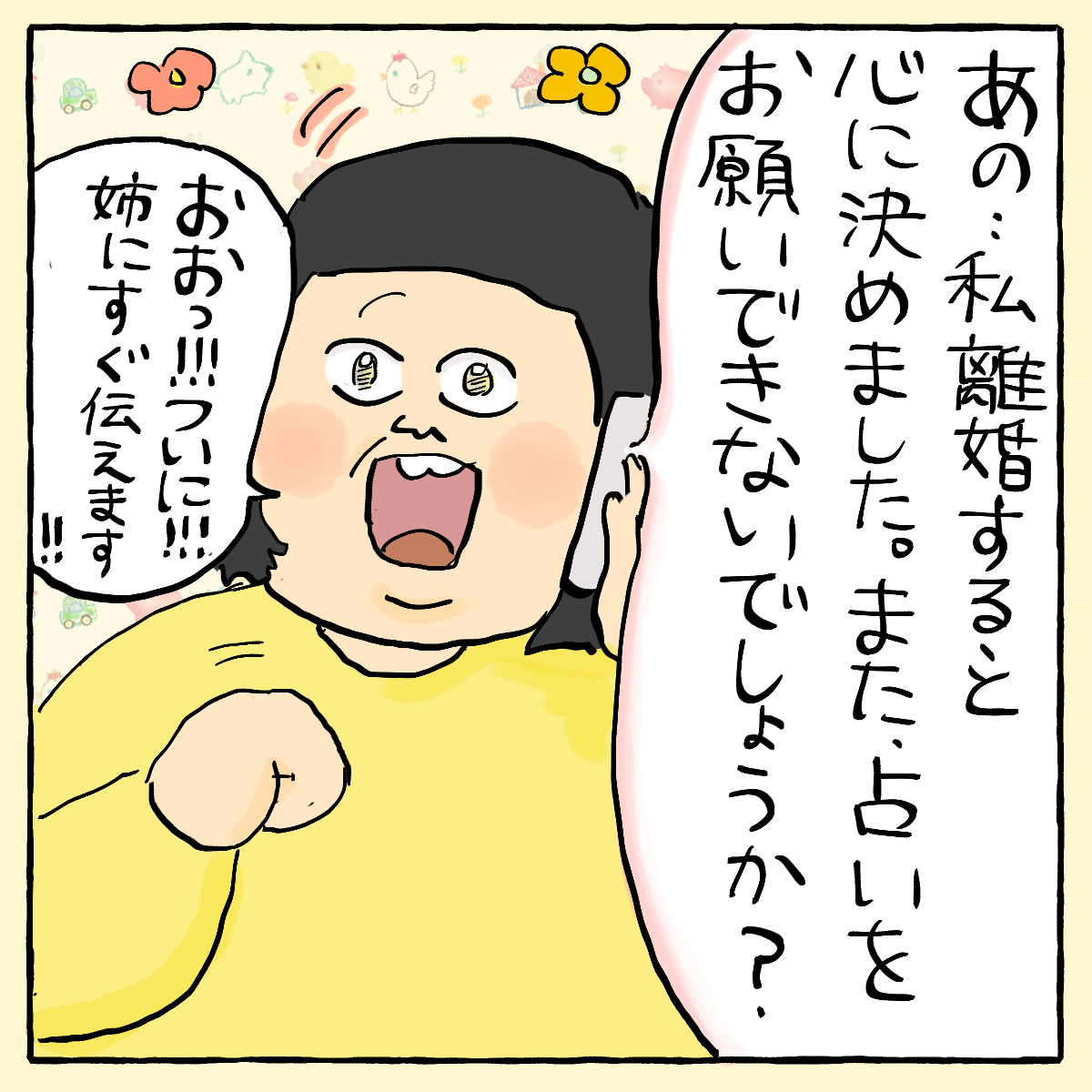 占いの予約?おおー!!ついに離婚する気になったのね!!!良かった良かったー!!と、詳しく話も聞かず電話を切り……。